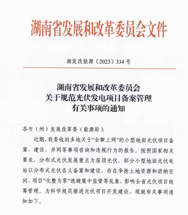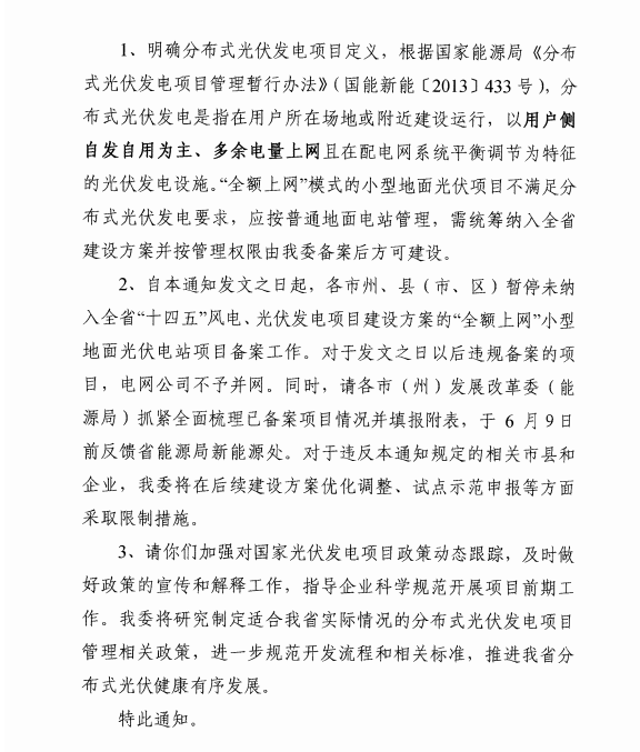 2.自本通知發文之日起,各市州、縣(市、區)暫停未納入全省“十四五”風電、光伏發電項目建設方案的“全額上網”小型地面光伏電站項目備案工作。對于發文之日以后違規備案的項目,電網公司不予并網。