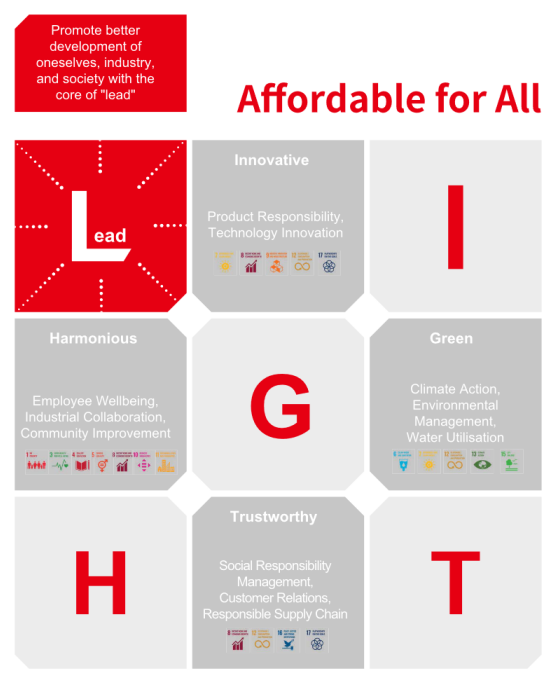 在報告中,隆基提出了“讓人人享有可負擔的清潔能源(Affordable for All)”的可持續發展目標,結合公司發展戰略、行業特點、國家發展規劃以及聯合國可持續發展目標,以“引領(Lead)”“創新(Innovative)”“綠色(Green)”“和諧(Harmonious)”“信賴(Trustworthy)”5項要素,形成了隆基“LIGHT”可持續發展理念體系。