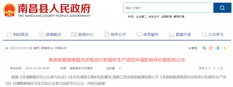 日前,江西南昌縣人民政府對卓森新能源南昌光伏電池片和組件生產項目環境影響評價報批前公示。