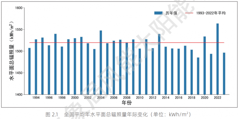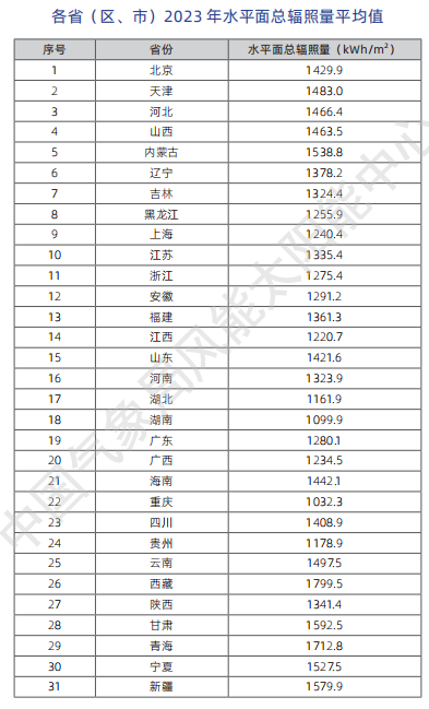 《公報》顯示,從水平面太陽能資源來看,2023年,全國太陽能資源總體為偏小年景,全國平均水平面總輻照量約為1496.1千瓦時/平方米,較近30年平均值偏小1.58%(23.6千瓦時/平方米),較近10年平均值偏小1.27%(19.0千瓦時/平方米)。較 2022 年偏小75.4千瓦時/平方米。
