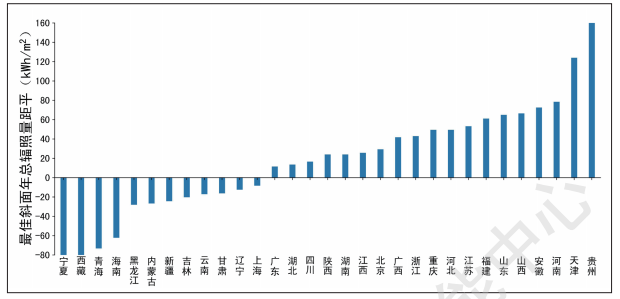 從各?。▍^、市)分布來看,吉林、云南、甘肅、遼寧、上海、廣東、湖北、四川最佳斜面總輻照量接近于近30年平均值。寧夏、西藏、青海、海南、黑龍江、內蒙古、新疆偏小 20kWh/m² 以上。陜西、湖南、江西、北京、廣西、浙江、重慶、河北、江蘇、福建、山東、山西、安徽、河南、天津、貴州偏大 20kWh/m² 以上。