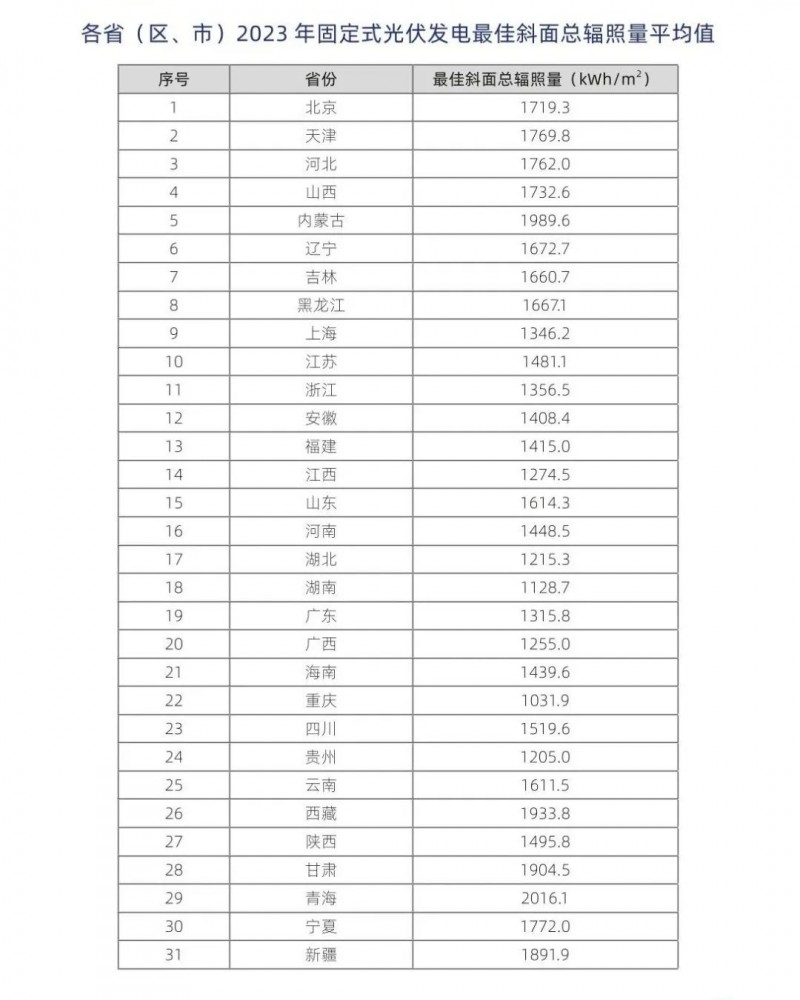2023 年,我國大部分地區最佳斜面總輻照量超過1100千瓦時/平方米,首年利用小時數在 900 小時以上。其中,新疆、 內蒙古、西北地區中西部、華北北部、西藏、西南地區西部等地最佳斜面總輻照量超過1800千瓦時/平方米,首年利用小時數在1400 小時以上;四川東部、重慶、貴州北部、湖南西部、 湖北西南部等地在1100千瓦時/平方米 以下,首年利用小時數一般低于900小時。