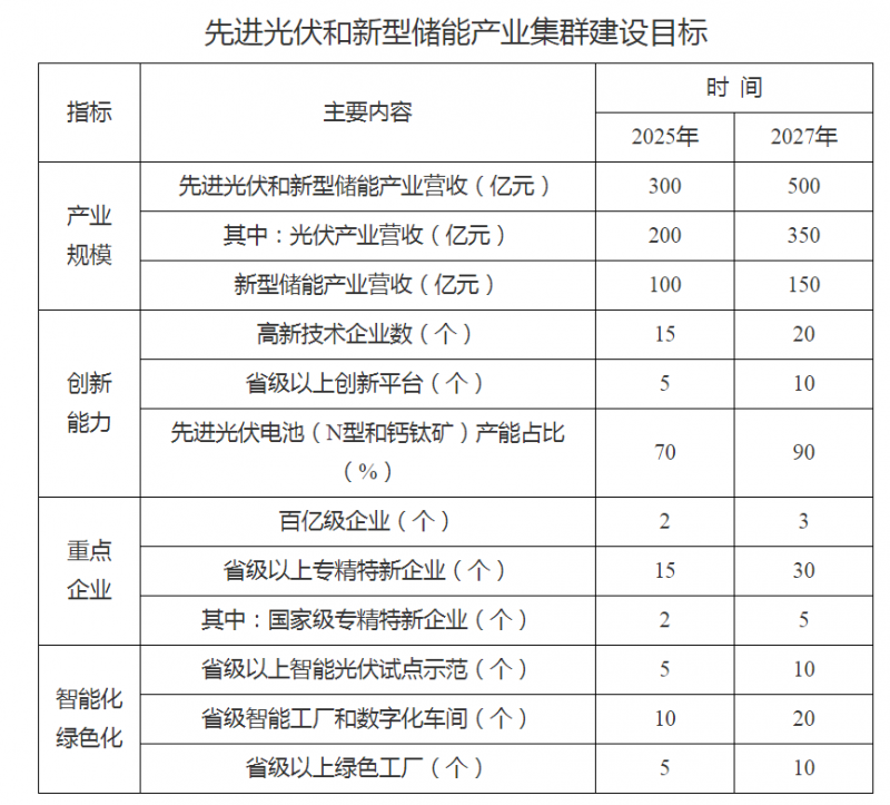 到2025年,全市先進光伏和新型儲能產業營業收入突破200億元,力爭達到300億元;到2027年,突破400億元,力爭達到500億元。先進光伏和新型儲能產業由集聚初期步入規模化發展階段,產業集群建設取得顯著進展,建成省級特色產業集群,力爭國家級特色產業集群建設上有突破。先進光伏方面,構建技術先進、優勢突出、配套完善的先進光伏產業生態體系,加快推動產業邁向價值鏈中高端;新型儲能方面,加快形成以鋰離子電池儲能為主導,鈉離子電池儲能、液流電池儲能、氫儲能等多元儲能技術協同推進的產業布局。