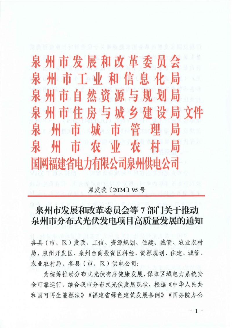 現將《泉州市發展和改革委員會等7部門關于推動泉州市分布式光伏發電項目高質量發展的通知》(泉發改〔2024〕95號)轉發給你們(詳見附件),請遵照執行。