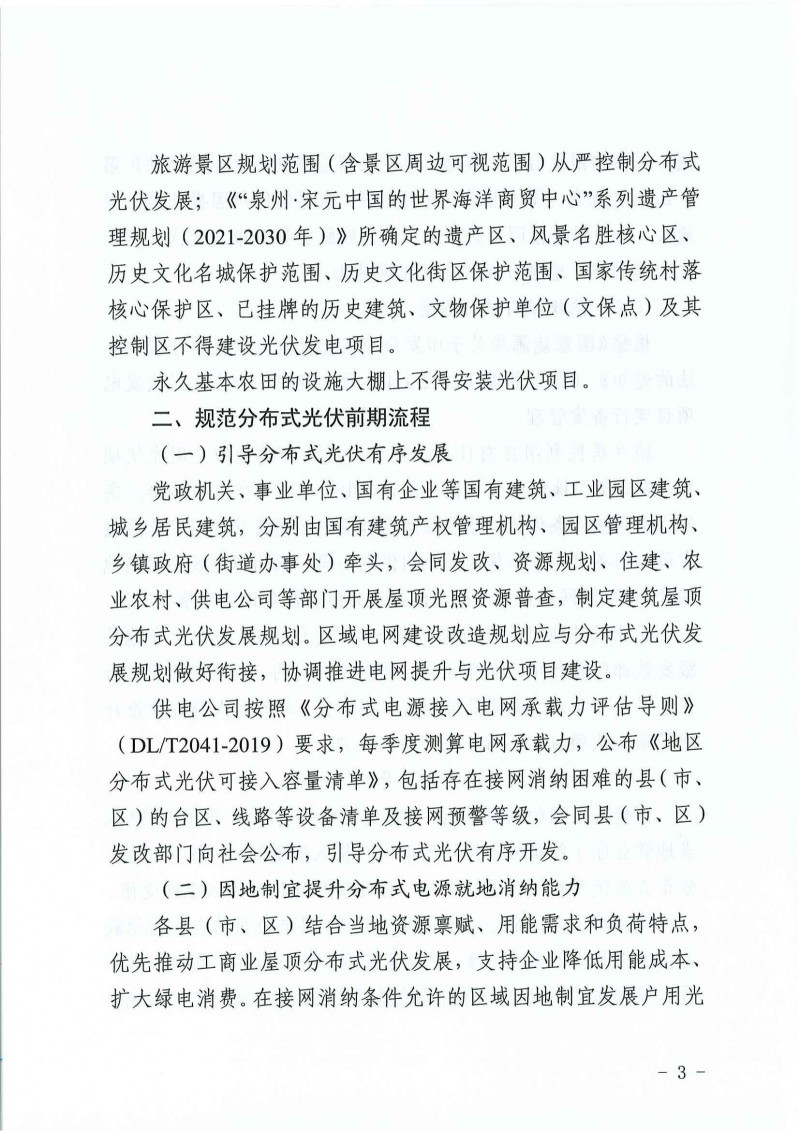 4月2日,泉州市鯉城區發展和改革局關于轉發《泉州市發展和改革委員會等7部門關于推動泉州市分布式光伏發電項目高質量發展的通知》的通知,通知指出,旅游景區規劃范圍(含景區周邊可視范圍)從嚴控制分布式光伏發展;《“泉州·宋元中國的世界海洋商貿中心”系列遺產管理規劃(2021-2030年)》所確定的遺產區、風景名勝核心區、歷史文化名城保護范圍、歷史文化街區保護范圍、國家傳統村落核心保護區、已掛牌的歷史建筑、文物保護單位(文保點)及其控制區不得建設光伏發電項目。永久基本農田的設施大棚上不得安裝光伏項目。