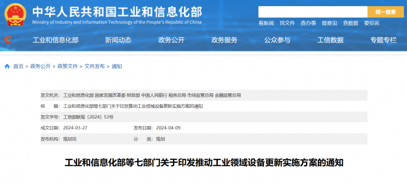 工業(yè)和信息化部等七部門關(guān)于印發(fā)推動工業(yè)領(lǐng)域設備更新實施方案的通知