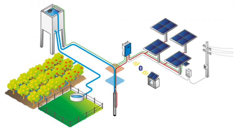 太陽能光伏水泵系統主要由三個部分組成:太陽能電池組件、光伏揚水逆變器和三相交流、直流水泵。先進的控制系統,根據日照強度的變化調節水泵轉速,使輸出功率接近太陽電池陣列的最大功率;當日照很充足時,保證水泵的轉速不超過額定轉速;當日照不足時,根據設定最低運行頻率是否滿足,否則自動停止運行。水泵由電機驅動,從深井中抽水,注入蓄水箱/池,或直接接入灌溉系統。