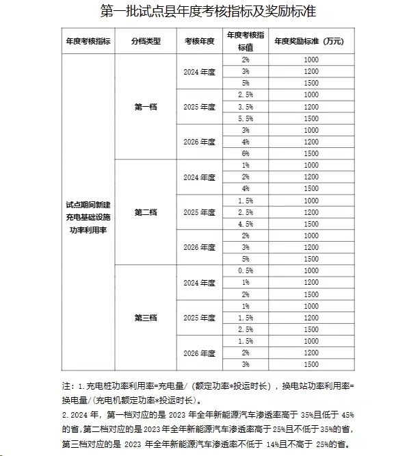 中央財政對經(jīng)三部門同意備案且完成任務目標的試點縣給予獎勵資金支持,每個試點縣示范期為3年。獎勵標準根據(jù)每年度試點縣充換電設施功率利用率達標情況設置,共分為三個檔次。示范期內(nèi),每年均達到最高目標的試點縣最多可獲得4500萬元(具體年度考核指標及獎勵標準見附件3)。