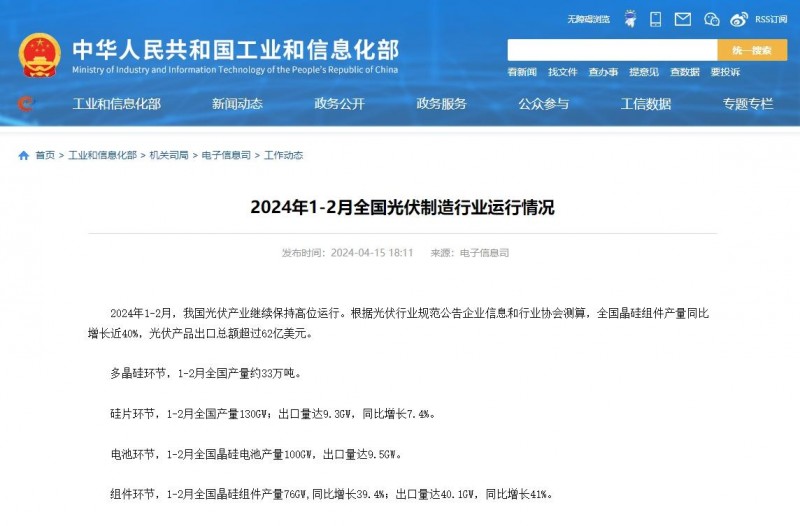 4月15日,工信部發布《2024年1-2月全國光伏制造行業運行情況》。數據顯示,1-2月全國硅料,產量約33萬噸;硅片產量130GW;出口量達9.3GW,同比增長7.4%;電池100GW,出口量達9.5GW;組件產量76GW,同比增長39.4%;出口量達40.1GW,同比增長41%。