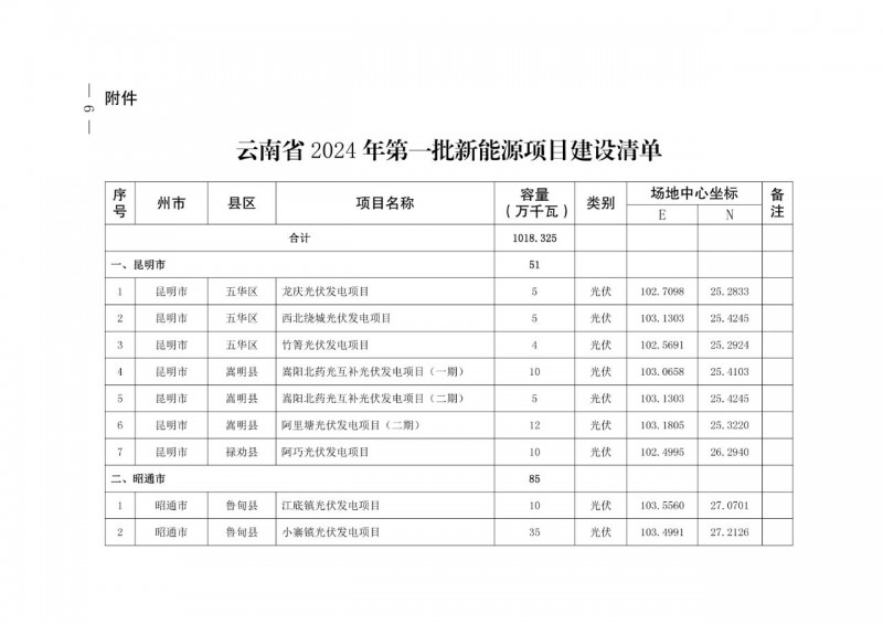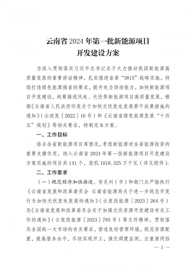 4月25日,云南省發改委及能源局聯合發布《關于印發云南省2024年第一批新能源項目開發建設方案的通知》。《通知》指出,納入云南省2024年第一批新能源項目開發建設方案實施的項目共141個,總規模1018.325萬千瓦。其中,光伏項目規模1006.36萬千瓦,風電11.965萬千瓦。