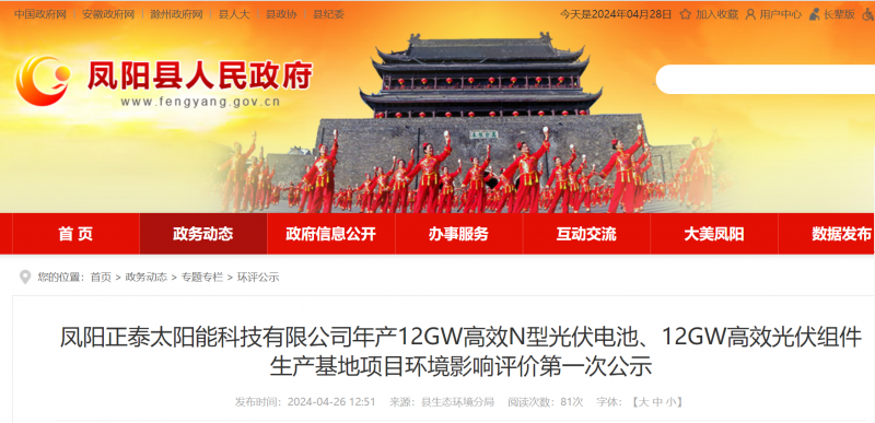 鳳陽正泰太陽能科技有限公司年產(chǎn)12GW高效N型光伏電池、12GW高效光伏組件生產(chǎn)基地項目環(huán)境影響評價第一次公示