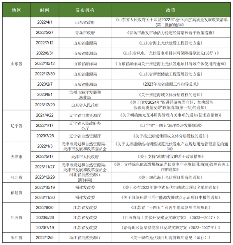 除了國家層面之外,近年來,山東、江蘇、遼寧、浙江等沿海省市都已出臺或醞釀出臺海上光伏的相關政策和規劃。
