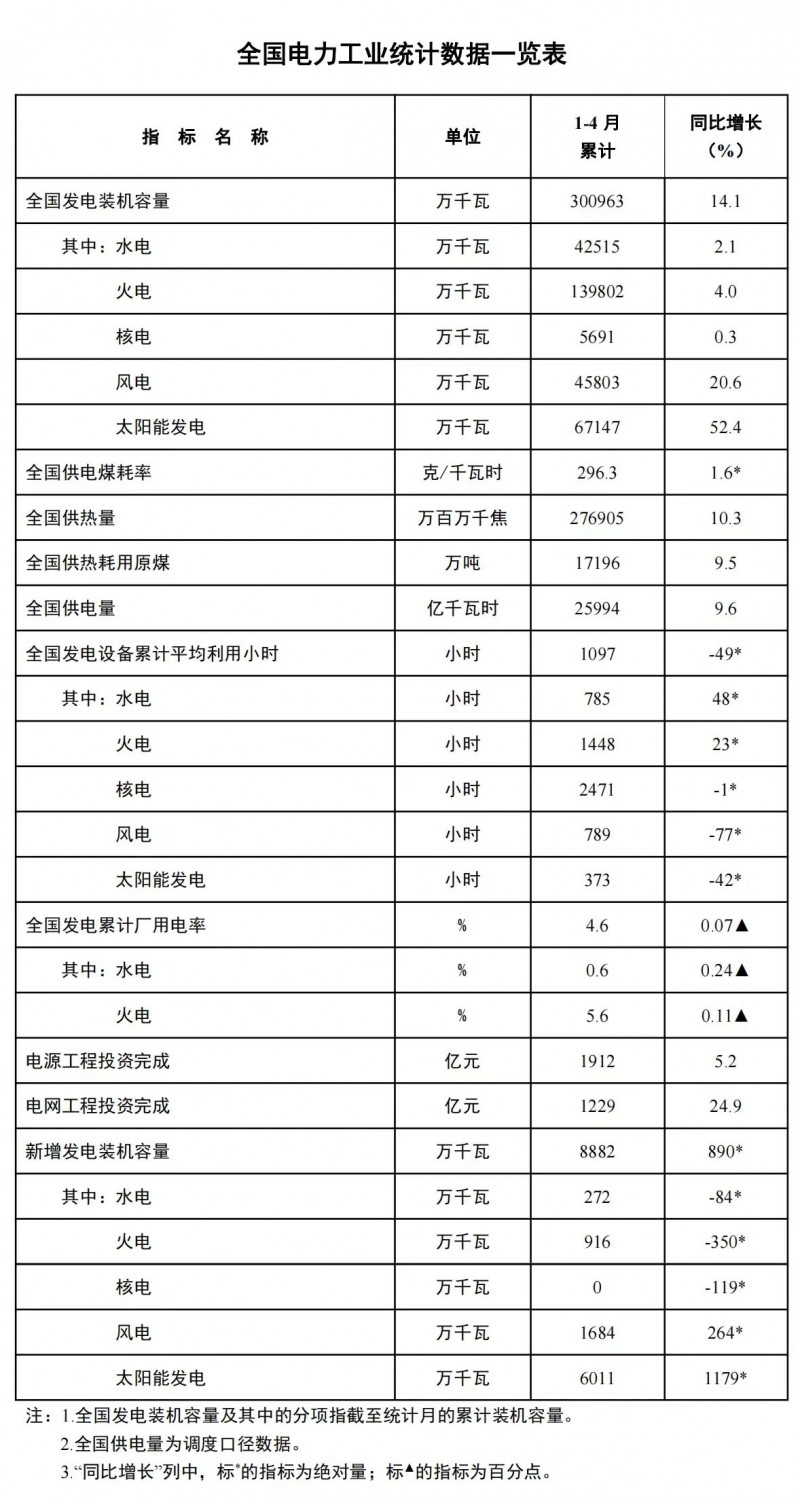1-4月份,全國發電設備累計平均利用1097小時,比上年同期減少49小時。其中,風電789小時,比上年同期減少77小時;太陽能發電373小時,比上年同期減少42小時;核電2471小時,比上年同期減少1小時;水電785小時,比上年同期增加48小時;火電1448小時,比上年同期增加23小時。