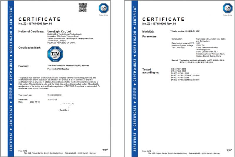 極電光能1.2m×0.6m鈣鈦礦組件IEC認(rèn)證證書
