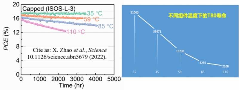 鈣鈦礦組件壽命到底能不能達(dá)到25年或者更長?實(shí)際上,學(xué)界已有很多的實(shí)驗(yàn)數(shù)據(jù)的為這一問題做出了解答。比如,2022年,Science上發(fā)表了一篇關(guān)于鈣鈦礦電池穩(wěn)定性的文章(Z.Zhaoetal,Science,10.1126/science.abn5679(2022)。作者通過界面鈍化等手段提升鈣鈦礦太陽電池的穩(wěn)定性,并對鈣鈦礦太陽電池在35-110°C、65%相對濕度、1200W/m2的輻照下(1.2sun/35-110°C/65%RH)進(jìn)行加速老化。結(jié)果顯示,當(dāng)溫度為35°C時(shí),老化3531小時(shí)后無任何衰退;隨著老化溫度的升高,可以觀察到電池效率的衰減,溫度越高衰減越快。當(dāng)溫度為110°C時(shí)老化2100小時(shí),效率衰退20%(如下圖所示)。下圖同時(shí)展示了不同老化溫度下,功率保持80%的時(shí)間(T80壽命)。