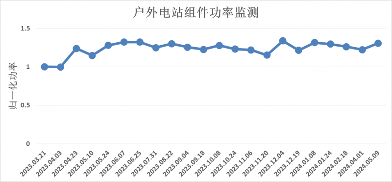 戶外實(shí)證是對光伏產(chǎn)品進(jìn)行穩(wěn)定性與可靠性檢驗(yàn)的最直接手段。極電光能去年3月搭建了鈣鈦礦戶外實(shí)證電站,目前已運(yùn)行了13個(gè)月。運(yùn)行期間對組件功率進(jìn)行定期測試,結(jié)果顯示,組件功率沒有衰減,反而略有提升。