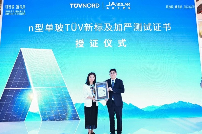 在此基礎上,TÜVNORD全球可再生能源高級副總裁、全球智慧能源中心總裁、大中華區副總裁須婷婷為晶澳科技單玻防積灰產品頒發了“n型單玻TÜV新標及加嚴測試證書”,再次印證了晶澳科技一以貫之的穩健可靠品質。