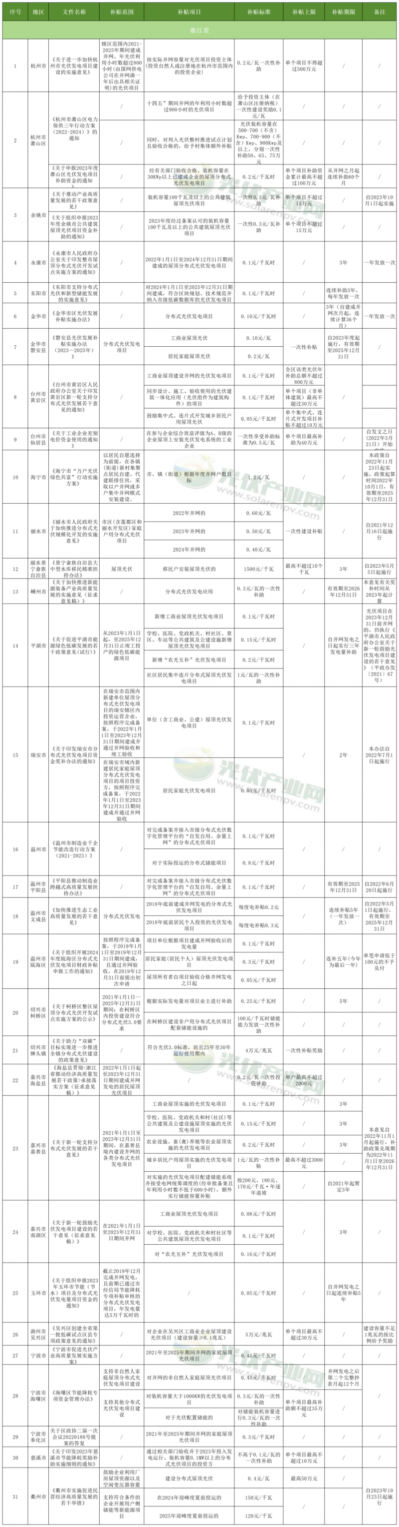 而在光伏補貼方面,浙江省也是遙遙領先。杭州市、杭州市蕭山區、余姚市、永康市、東陽市、金華市、金華市磐安縣、臺州市黃巖區、臺州市仙居縣、海寧市、麗水市、麗水景寧畬族自治縣、嵊州市、平湖市、瑞安市、溫州市、溫州市平陽縣、溫州市文成縣、溫州市甌海區、紹興市柯橋區、紹興市牌頭鎮、嘉興市海鹽縣、嘉興市嘉善縣、嘉興市南湖區、玉環市、湖州市吳興區、寧波市、寧波市海曙區、寧波市奉化區、慈溪市、衢州市31地發布分布式光伏補貼相關政策。