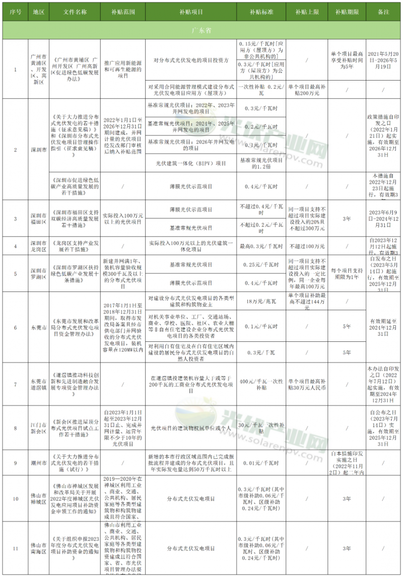 截止目前,廣東廣州市(黃埔區、開發區、高新區)、深圳市、深圳福田區、深圳市龍崗區、深圳市羅湖區、東莞市、東莞市道滘鎮、江門市新會區、潮州市、佛山市禪城區、佛山市南海區11地發布分布式光伏補貼政策。
