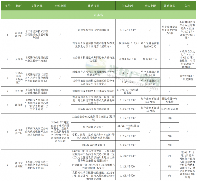 近日,江蘇省發改委發布《關于高質量做好全省分布式光伏接網消納的通知(征求意見稿)》,計劃大力支持分布式光伏的發展。截至目前,江蘇有7地給予補貼政策,集中在南京、無錫、常州、溧陽、蘇州等地。