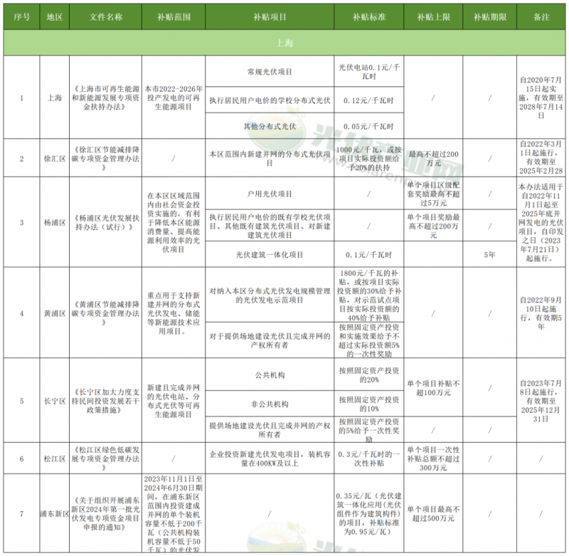 上海同樣有7地給予補貼。近日,上海市浦東新區人民政府發布關于組織開展浦東新區2024年第一批光伏發電專項資金項目申報的通知,通知指出,在申報范圍內的項目,按照裝機容量給予補貼,補貼0.35元/瓦(光伏建筑一體化應用(光伏組件作為建筑構件)的項目,補貼標準為0.95元/瓦),單個項目最高不超過500萬元。
