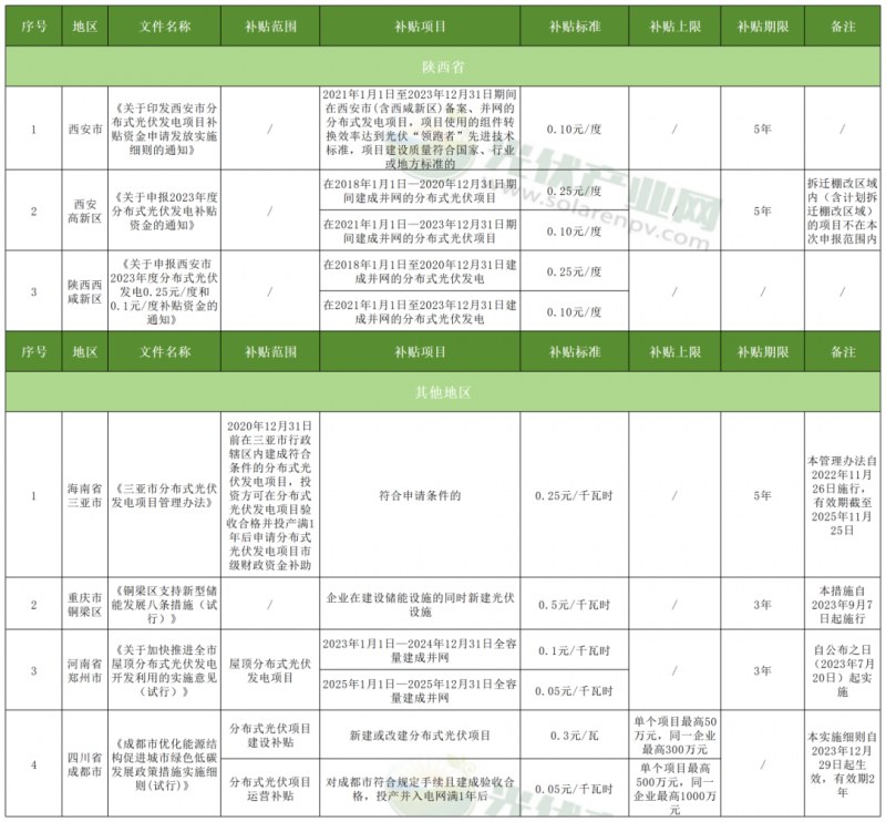 除此之外,陜西省發展和改革委員會7月16日發布《關于進一步推動分布式光伏發電項目高質量發展的通知》,通過十大舉措進一步推動分布式光伏高質量發展。西安高新區和陜西西咸新區分別對在2018年1月1日—2020年12月31日期間建成并網的分布式光伏項目和在2021年1月1日—2023年12月31日期間建成并網的分布式光伏項目給予0.25元/度和0.10元/度的補貼。