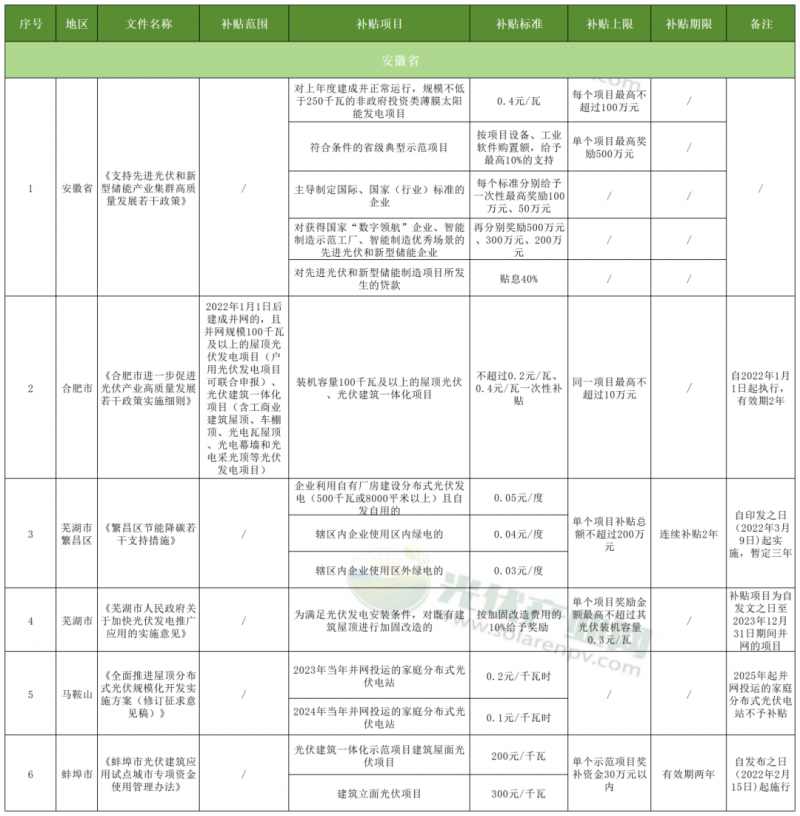 今年4月,安徽省工業和信息化廳等五部門聯合印發全省首個光儲產業專項支持政策——《支持先進光伏和新型儲能產業集群高質量發展若干政策》,綜合運用政策資金、產業基金、資源要素等多種手段,“真金白銀”助力全省光儲產業高質量發展。除此之外,合肥市、蕪湖市、蕪湖市繁昌區、馬鞍山市、蚌埠市5地給予補貼。