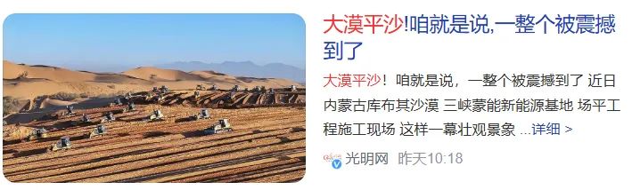 在“死亡之海”里修建“光伏長城”,從此讓“沙土”變?yōu)?ldquo;沙金”,人民日報等多家媒體對此爭相報道,網友們大為贊嘆:“太震撼了!了不起!”