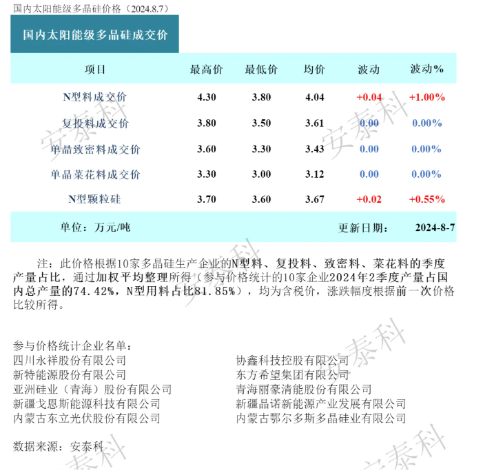 截至本周,國內(nèi)多晶硅在產(chǎn)企業(yè)數(shù)量維持在19家,處于檢修狀態(tài)的企業(yè)為14家,新疆地區(qū)受極端天氣影響檢修恢復(fù)情況不及預(yù)期。據(jù)統(tǒng)計(jì),2024年7月國內(nèi)多晶硅產(chǎn)量為13.8萬噸,環(huán)比下降14.53%。根據(jù)企業(yè)排產(chǎn)計(jì)劃,預(yù)計(jì)8月國內(nèi)多晶硅產(chǎn)量將與7月持平。