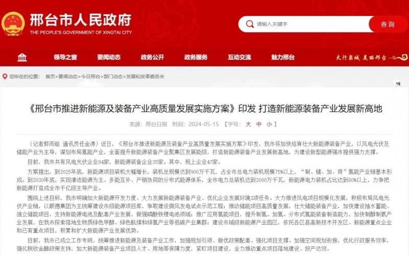 政策利好——2024年5月,《邢臺市推進新能源及裝備產業高質量發展實施方案》印發,邢臺市將加快培育壯大新能源裝備產業,以風電光伏及儲能產業為主導,謀劃布局氫能產業,全面提升新能源裝備產業聚集區發展能級,打造新能源裝備產業發展新高地,為建設新型能源強市提供強力支撐。