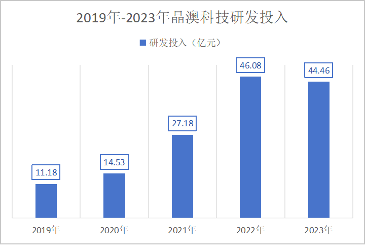 2019-2022年,晶澳科技的研發投入分別為11.18億元、14.53億元、27.18億元、46.08億元,2021、2022年兩年的研發投入合計超73億元。2023年,晶澳科技研發投入44.46億元,占營業收入5.45%,位居同行業前列。截至2023年末,公司自主研發已授權專利1263項,其中發明專利285項。