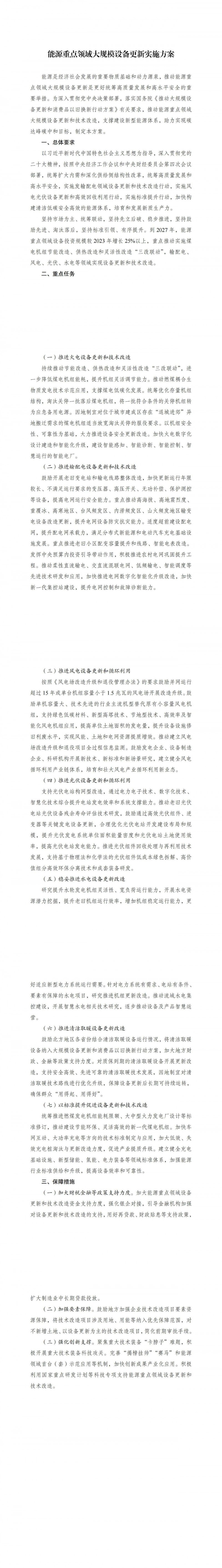 為貫徹落實國務院《推動大規模設備更新和消費品以舊換新行動方案》(國發〔2024〕7號),推動能源重點領域大規模設備更新和技術改造,國家發展改革委、國家能源局組織編制了《能源重點領域大規模設備更新實施方案》。現印發給你們,請認真組織實施。
