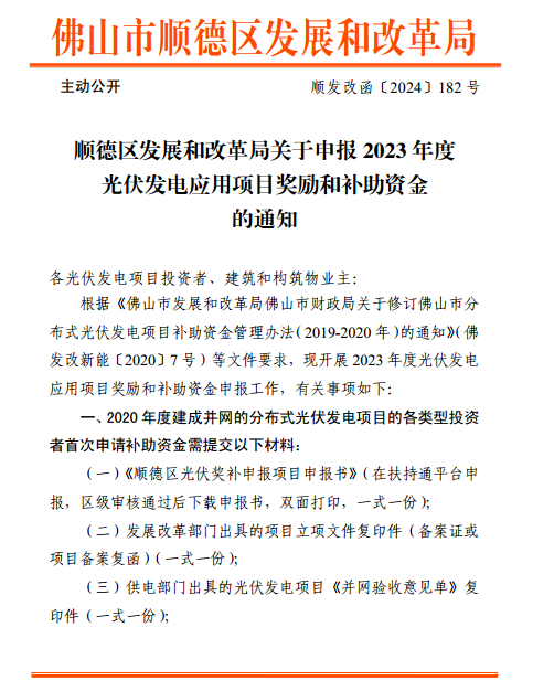 8月22日,順德區(qū)發(fā)展和改革局發(fā)布關于組織申報2023年度光伏發(fā)電應用項目獎勵和補助資金的通知。