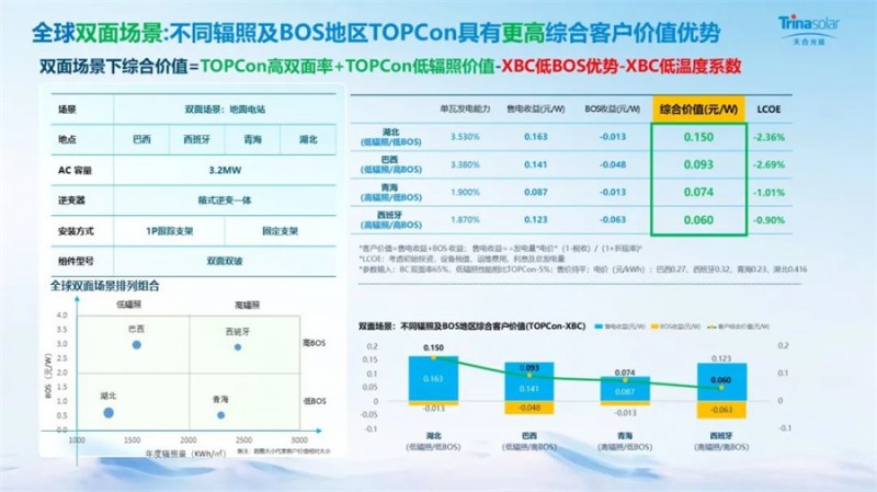 在張映斌看來,雙面率和低輻照這兩大優勢對TOPCon最為關鍵。張映斌介紹說,未來五年,全球光伏電站應用場景中70%以上為雙面場景,同時全球典型地區低輻照時長占比超90%。TOPCon在這些場景中明顯更具性能優勢,中午的時候,雙面率高起主要作用;而低輻照性能則在早晚發揮增益優勢。
