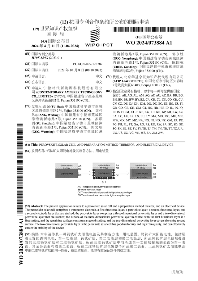 2024年4月和7月,寧德時代先后公開了“鈣鈦礦太陽能電池及其制備方法、用電裝置”的國際專利申請,以及獲得“碘化鉛的制備方法、鈣鈦礦太陽能電池及用電裝置”專利授權的消息。