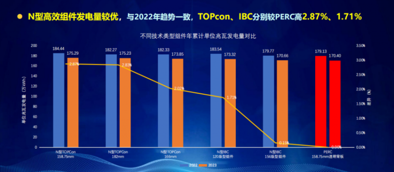 今年3月,國家光伏、儲能實(shí)證實(shí)驗(yàn)平臺(大慶基地)公布了2023年度實(shí)證實(shí)驗(yàn)數(shù)據(jù)成果。該成果表示,N型高效組件發(fā)電量較優(yōu),與2022年趨勢一致,TOPCon、IBC分別較PERC高2.87%、1.71%,即158.75版型的TOPCon發(fā)電量較120版型的IBC高1.16%。進(jìn)一步分析發(fā)現(xiàn),如果用比較相同(相近)硅片尺寸進(jìn)行比較,158.75mm的TOPCon相對156mm版型的IBC的發(fā)電增益大約為2.72%。