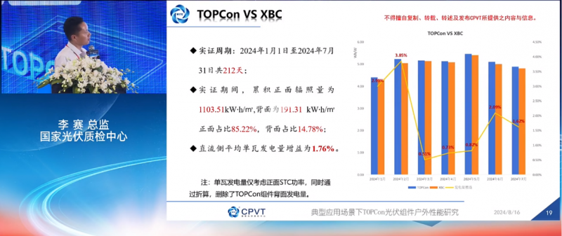CPVT位于銀川的實(shí)證基地,代表溫帶大陸性氣候場景,干熱,溫差大。通過對客戶自行組織送樣的三串不同技術(shù)路線組件性能比對實(shí)證項(xiàng)目的數(shù)據(jù)分析,2024年1月至2024年7月的實(shí)證期內(nèi),在以正面STC功率為基準(zhǔn)計(jì)算得出:半片雙面TOPCon組件的正面單瓦發(fā)電量較XBC組件增益為1.76%。