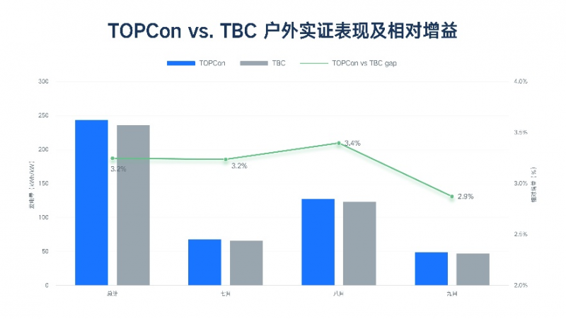 從測試周期內(nèi)的發(fā)電量數(shù)據(jù)來看,TOPCon組件相較于TBC組件的單瓦平均發(fā)電增益高3.15%,最高月相對增益達(dá)3.4%(2024年8月),充分證明了TOPCon組件的卓越發(fā)電能力。