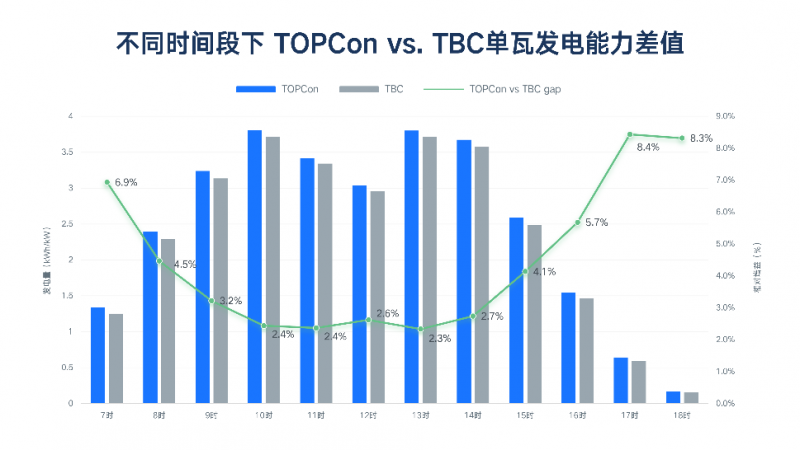 通過進(jìn)一步分析一天不同時(shí)段的發(fā)電量數(shù)據(jù),可以發(fā)現(xiàn)TOPCon組件具有顯著的低輻照優(yōu)勢。一般來說,光伏組件大部分時(shí)間都是在低于1000W/m²的輻照度下工作,因此低輻照性能越優(yōu),組件單瓦發(fā)電能力越高。通過以往的實(shí)測數(shù)據(jù),TOPCon的低輻照性能相比XBC高約5%。根據(jù)實(shí)證數(shù)據(jù),在早晚輻照相對較弱時(shí)段,TOPCon組件發(fā)電量數(shù)據(jù)遠(yuǎn)超TBC組件。在早上7-8點(diǎn)時(shí),TOPCon相比TBC單瓦發(fā)電能力高6.9%;晚上17-19點(diǎn)時(shí),相對增益更是高達(dá)8.3%-8.4%。