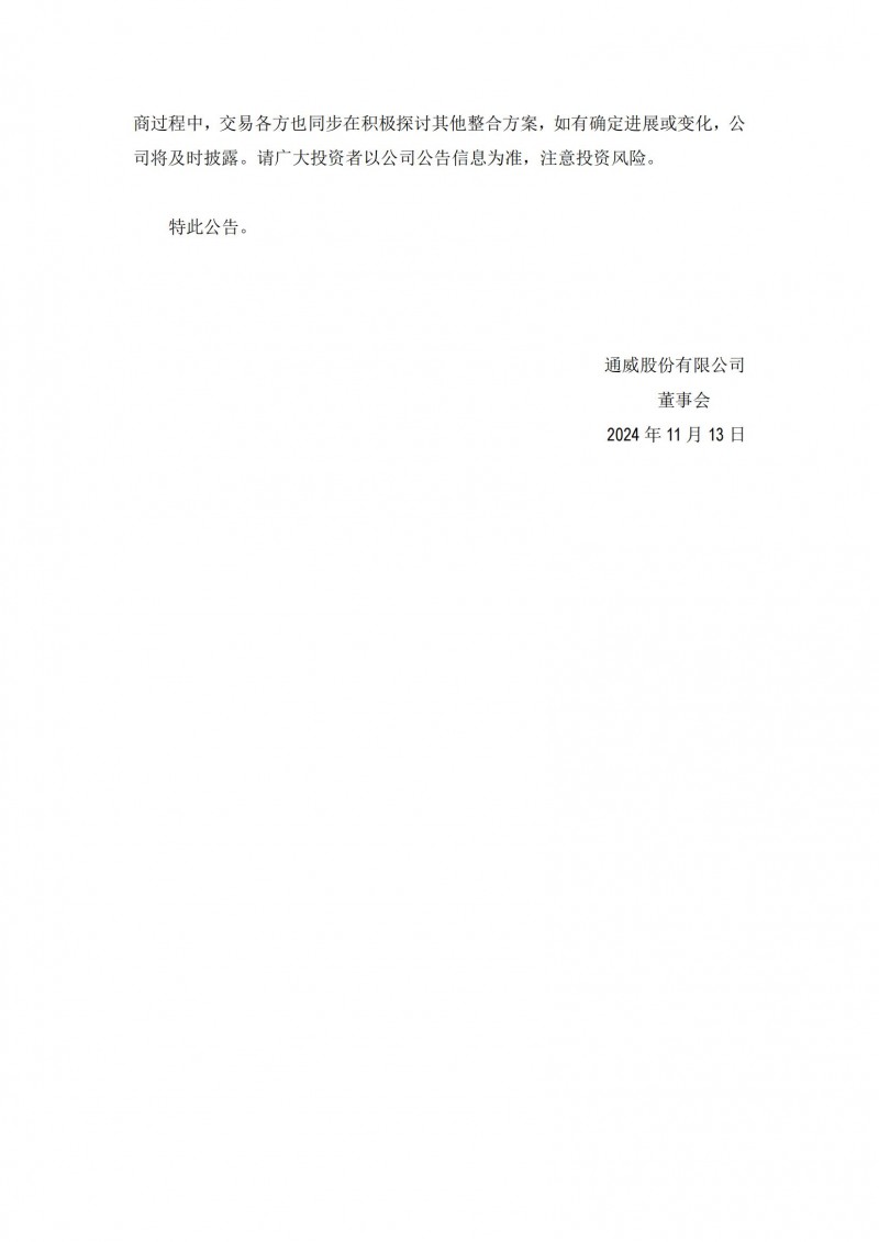 通威股份在公告中表示,雙方協議簽署后,公司立即組織業務團隊及相關中介機構對潤陽股份進行全面盡職調查以及審計、評估工作。截至目前,相關工作尚在進行中,交易各方仍在持續就交易相關事項進行磋商,不排除原交易方案可能存在調整或終止的風險;磋商過程中,交易各方也同步在積極探討其他整合方案,如有確定進展或變化,公司將及時披露。
