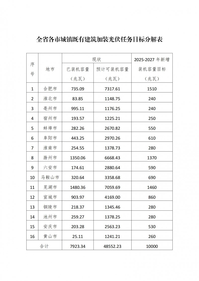 到2027年,新增城鎮(zhèn)既有建筑加裝光伏裝機容量力爭達到10000兆瓦,建筑光伏一體化在全省各類建筑實現(xiàn)規(guī)模化、市場化應用,基本形成安徽特色建筑光伏產(chǎn)業(yè)高質量發(fā)展格局。