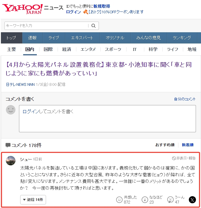 有網友甚至在表達反對意見時提及中國,稱“太陽能板的工廠設在中國。強制實施后,國家必然獲利。此外,一旦發生近年來的大臺風以及像去年那樣的冰雹災害,所有太陽能板都得重新更換,維護費用也會非常高。那么,最終到底對誰最有利呢?希望能夠再認真考慮一下這個問題。”有872人對該條評論表示贊同。