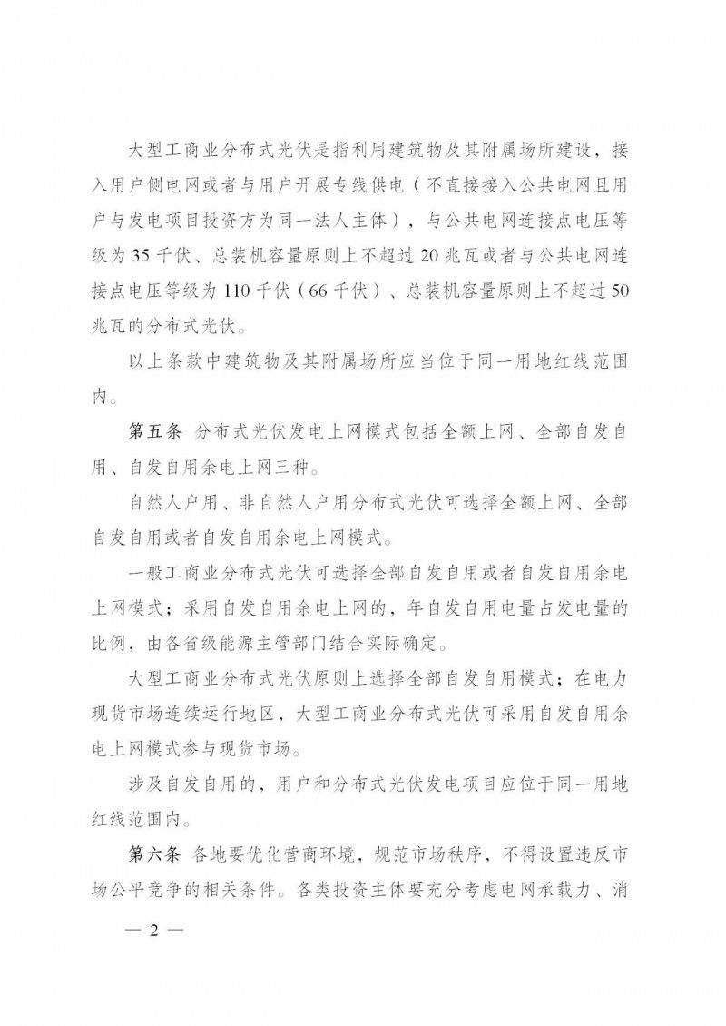 一般工商業分布式光伏可選擇全部自發自用或者自發自用余電上網模式;采用自發自用余電上網的,年自發自用電量占發電量的比例,由各省級能源主管部門結合實際確定。