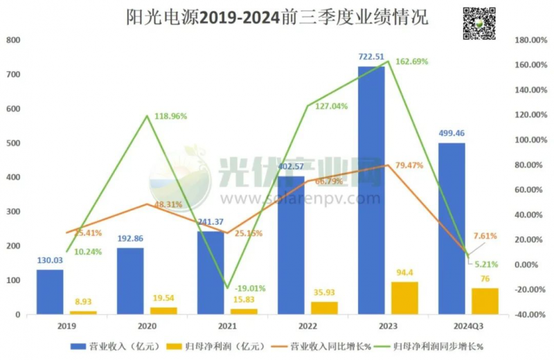 從已公布的2024前三季度業(yè)績來看,陽光電源的盈利水平毋庸置疑。據(jù)統(tǒng)計,2024年前三季度陽光電源營收近500億,已超過2022年全年營收總額,以下是2019——2024(Q1-Q3)陽光電源的六年業(yè)績統(tǒng)計詳表:
