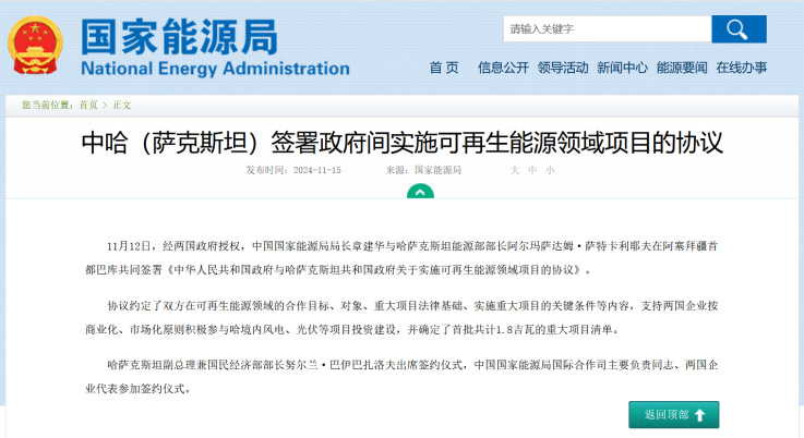 2024年11月12日,中國國家能源局局長章建華與哈薩克斯坦能源部部長阿爾瑪薩達(dá)姆·薩特卡利耶夫在阿塞拜疆首都巴庫共同簽署了《中華人民共和國政府與哈薩克斯坦共和國政府關(guān)于實(shí)施可再生能源領(lǐng)域項(xiàng)目的協(xié)議》。