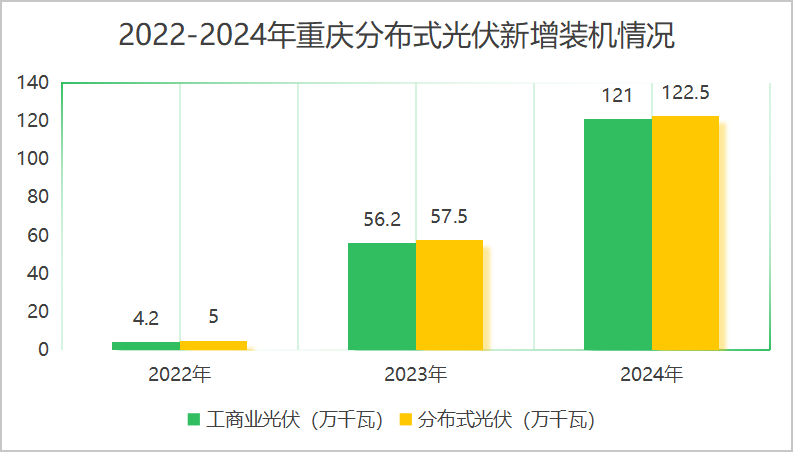 具體來看,重慶分布式光伏裝機容量增長迅猛,2024年新增裝機達到122.5萬千瓦,同比增長113%,延續(xù)了2023年增速全國第一的亮眼表現(xiàn);其中工商業(yè)分布式新增裝機121萬千瓦,占比近99%,發(fā)展勢頭強勁。