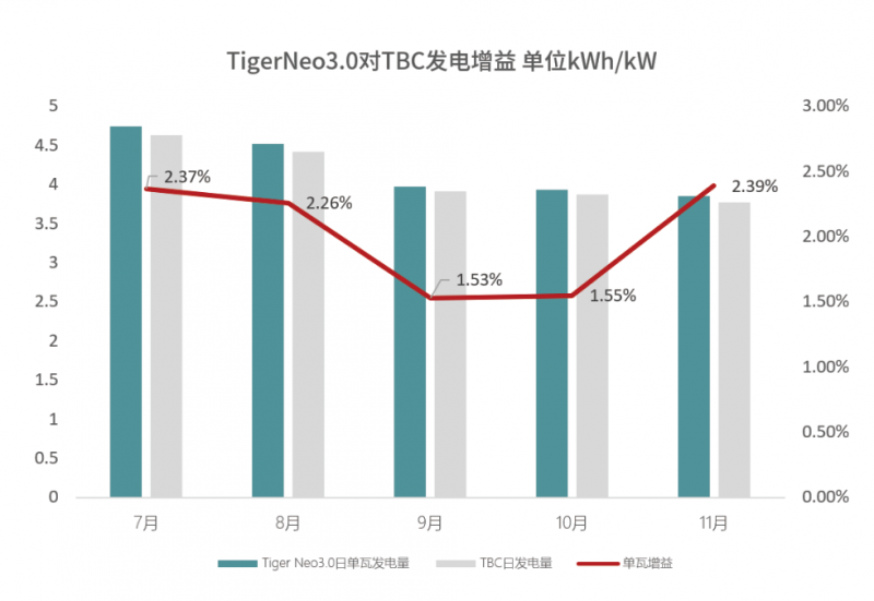 數據顯示,在2024年7月-11月測試期間,TigerNeo3.0組件日平均發電4.21kWh/kW,TBC組件日平均發電4.13kWh/kW,發電量增益為2.04%。這一結果充分證明了晶科TOPCon技術TigerNeo3.0組件在高效發電方面的顯著優勢。
