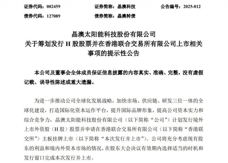 2月21日,晶澳科技(SZ:002459)發(fā)布公告,為進(jìn)一步推動(dòng)公司全球化發(fā)展戰(zhàn)略,加快市場、供應(yīng)鏈、研發(fā)三位一體的全球化建設(shè),打造國際化資本運(yùn)作平臺(tái),提升國際品牌形象,提高公司資本實(shí)力和綜合競爭力,公司計(jì)劃發(fā)行境外上市外資股(H股)股票并申請?jiān)谙愀勐?lián)合交易所有限公司主板掛牌上市。