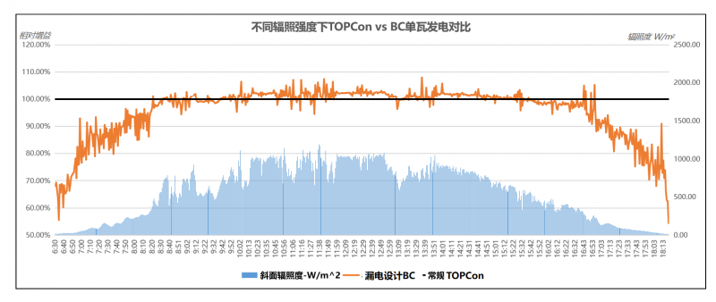 1、 TOPCon弱光下的發電表現顯著優于漏電設計BC組件
