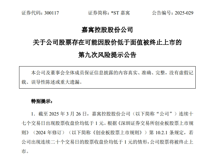 此外,*ST嘉寓還存在一些其他可能導致退市的風險。比如公司近日多次在公告中提及,根據公司此前發布的2024年度業績預告,經公司財務部門測算,預計2024年度期末歸屬于上市公司股東的凈資產為-21.06億元到-19.56億元。如果經審計后的公司2024年度期末凈資產為負值,公司股票將被終止上市。